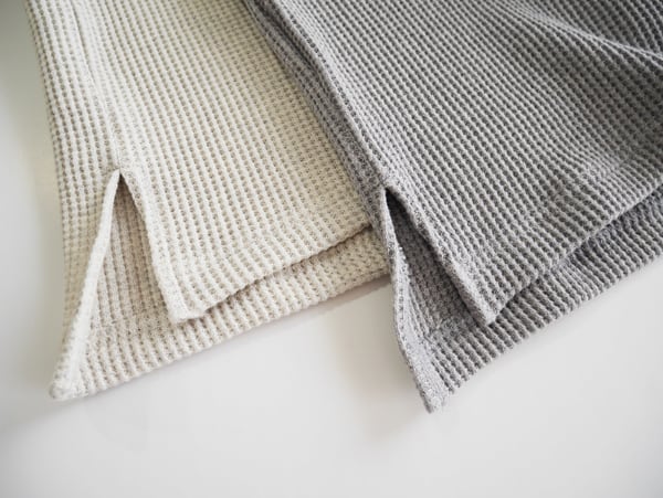 空紡糸で編み立てたコットンワッフル素材は、ほどよく厚みがありつつ軽やかで、さらっとした肌ざわりとナチュラルな風合いが特徴です。