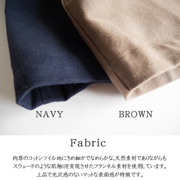 表面に起毛加工をほどこしたコットンフランネル素材で仕立てた、やわらかくてあたたかみのあるスタンドカラーブルゾンです。