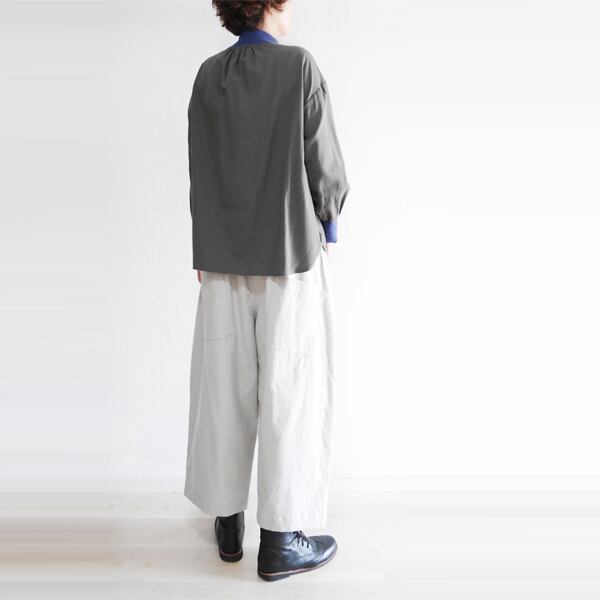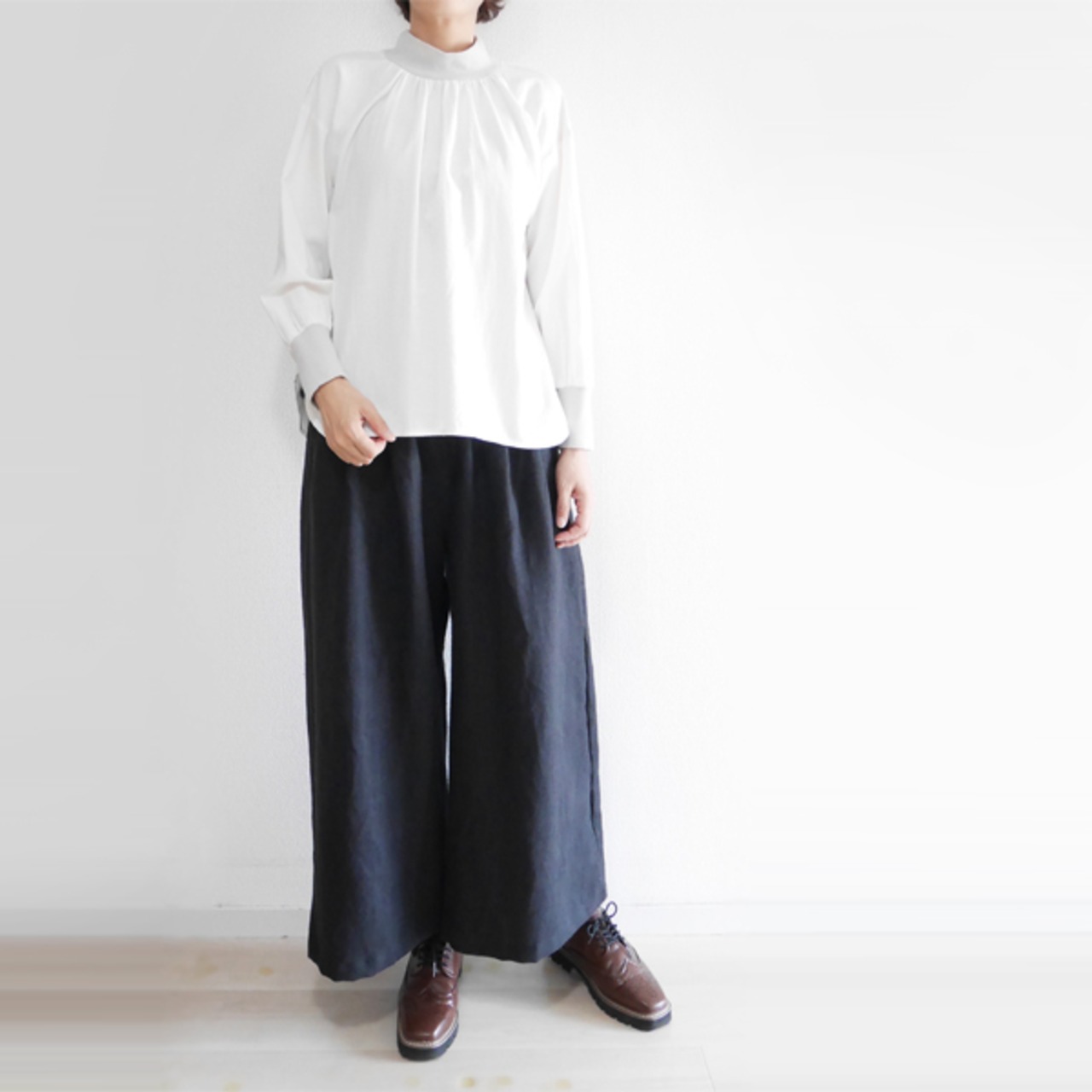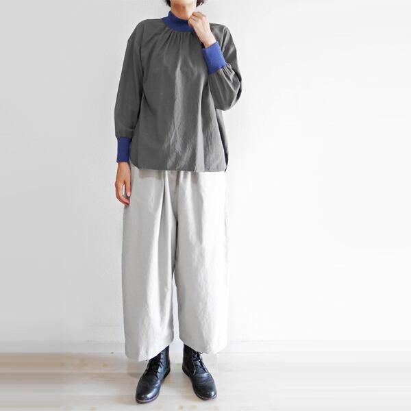 前後の襟元には繊細なギャザーを寄せ、ハイネックの衿と袖口にはリブをあしらって、カジュアル感とリラックスできるシルエットながらもほど良くきちんと見えする一枚です。