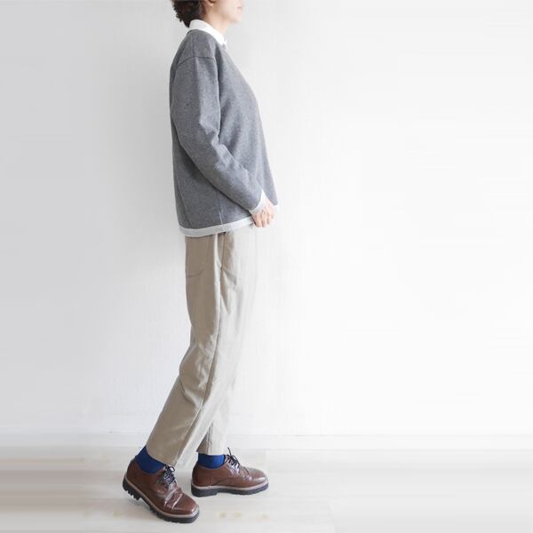 フロントには大きめのタックを内向きにひとつ入れ、腰回りにゆとりを持たせながら、裾にかけてやや細くなるすっきりとしたテーパードシルエットに仕上げました。