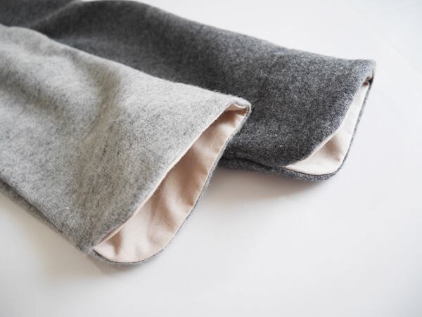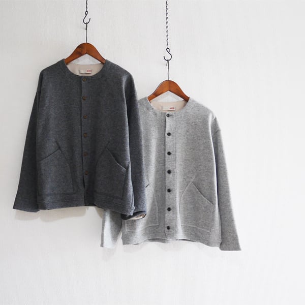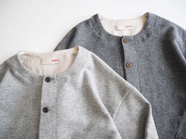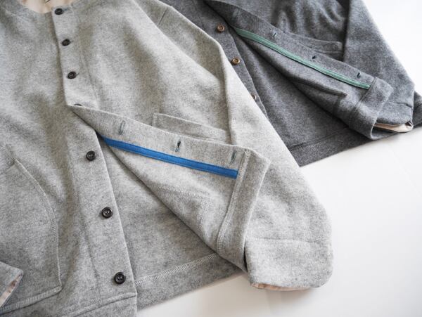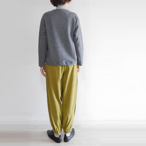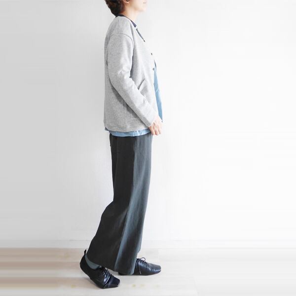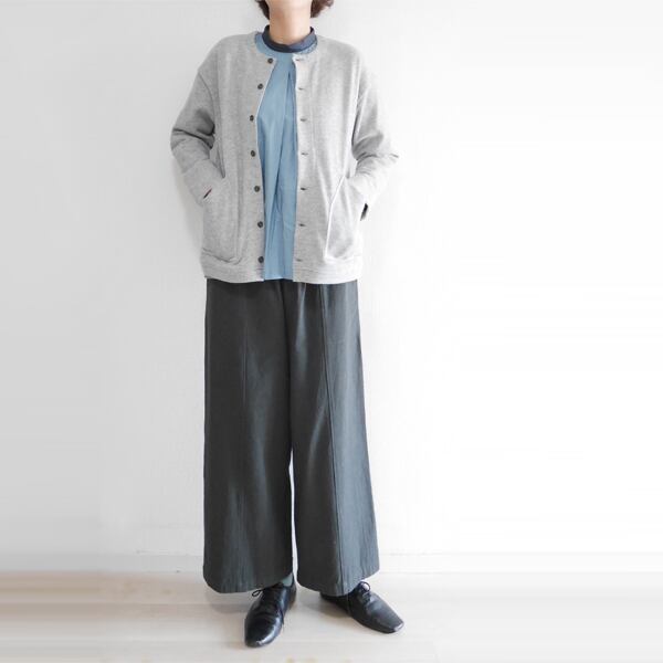 ふっくらと空気を含んだウールミックスの紡毛天竺という生地は、軽やかで温かみがあり、やさしい伸縮性が着用時に心地よくリラックス感のある素材です。