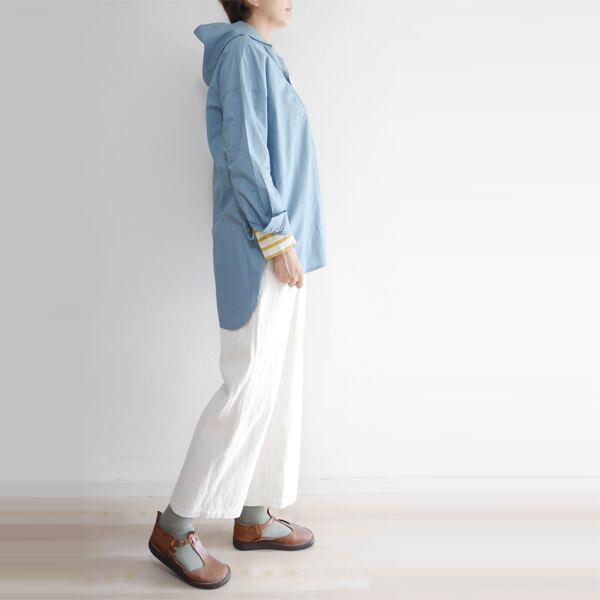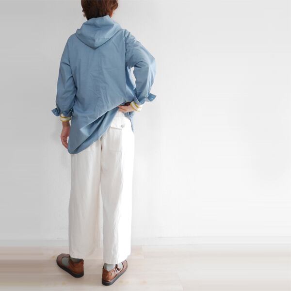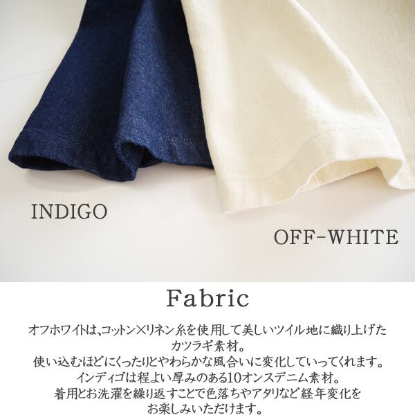 こちらの製品にはインディゴ染料を使用していますので、お洗濯をくりかえすたびに洗いざらしの色調と風合いがお楽しみいただけます。