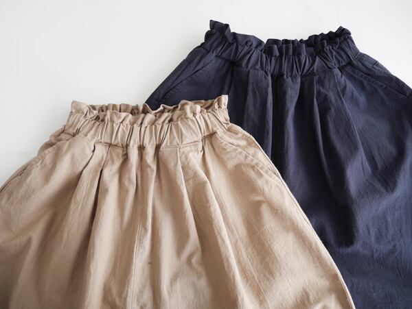 腰まわりにはたっぷりとボリュームを持たせ、裾にかけてすっきりと絞ったバレルシルエット。