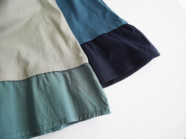 40/2コーマ天竺のやわらかくなめらかなカットソー生地をベースに、60ローンの軽やかな布帛を裾にドッキングした一枚。