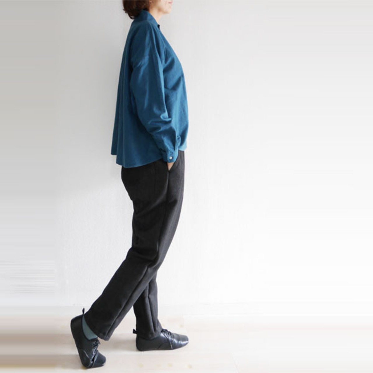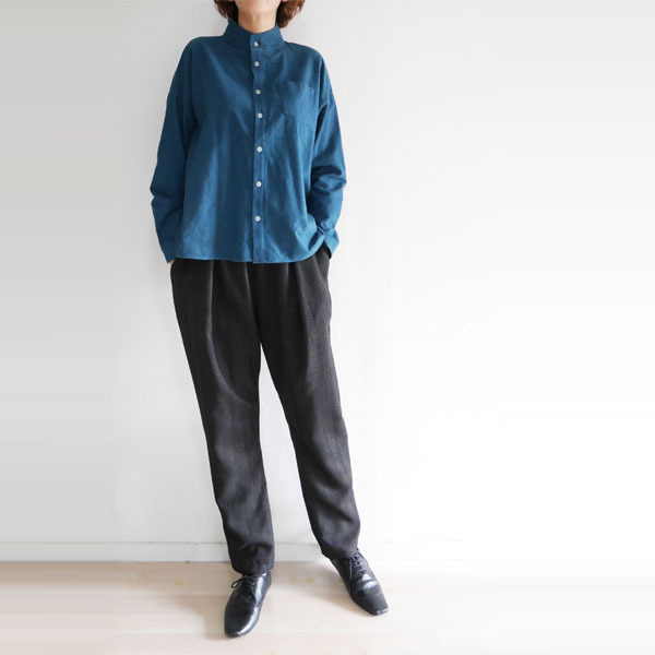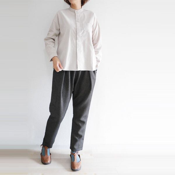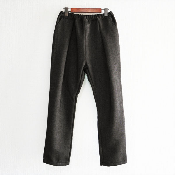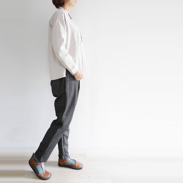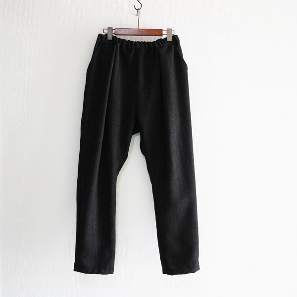 フロントには深いタックが入っており、裾にかけて細くなっていくテーパードシルエットのパンツです。