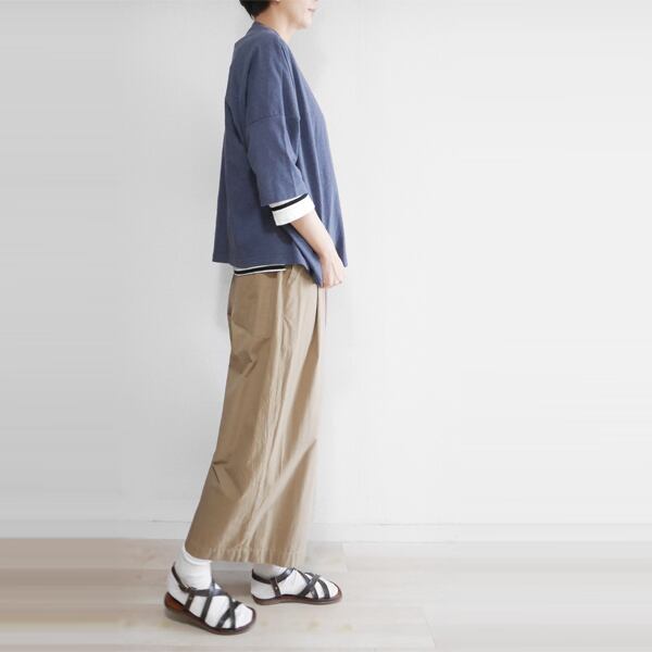 リネンの中でも品質がよく、衣料用途に最適とされる上質なベルギーリネンとコットンを混紡させることで、お洗濯や度重なる着用によるヨレやねじれを極力おさえてくれます。