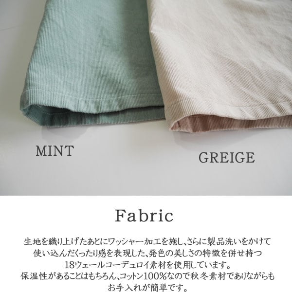 生地を織り上げたあとにワッシャー加工を施し、さらに製品洗いをかけて使い込んだくったり感を表現した、発色の美しさの特徴を併せ持つ18ウェールコーデュロイ素材を使用しています。